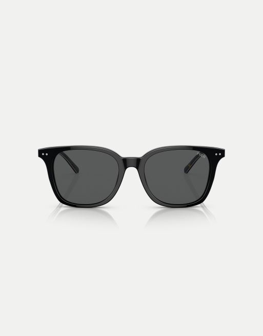 Polo Ralph Lauren – Ph4187 – Rechteckige Sonnenbrille in glänzendem Schwarz mit grauen Gläsern