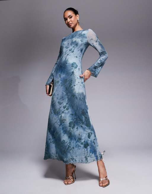 Rare London – Maxikleid in Blaugrün mit ausgestellten Ärmeln, transparenten Details und Blumenmuster