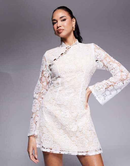 Rare London – Minikleid aus Spitze in Weiß mit asymmetrischer Schnürung