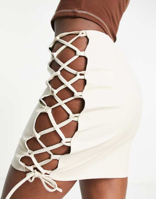 Rebellious Fashion – Minirock in Lederoptik in Ecru mit Schnürung, Kombiteil