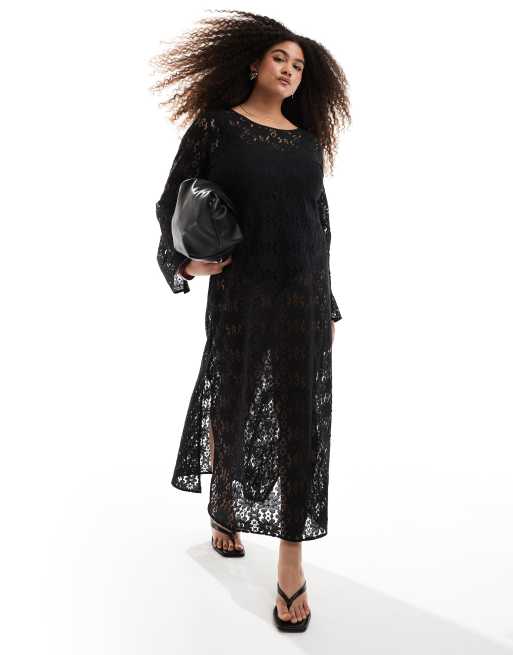 Renée Studio Plus – Exklusiv – Langärmliges Spitzen-Maxikleid in Schwarz