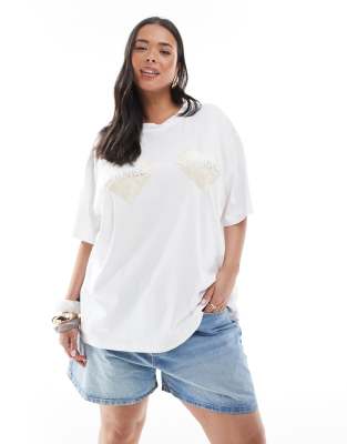 Renee Studio Plus – Exklusiv – T-Shirt in Weiß mit perlmuttfarbenem Muschelmuster und Herz-Detail