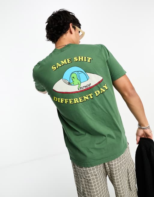 RIPNDIP – T-Shirt in Grün mit „Different Day“-Print auf Brust und Rücken