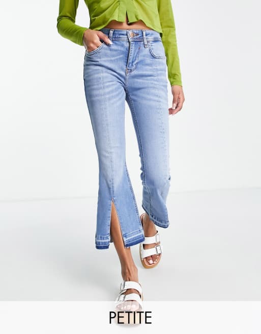 River Island Petite – Ausgestellte Jeans in Mittelblau mit Saumschlitz vorne und kurzem Schnitt