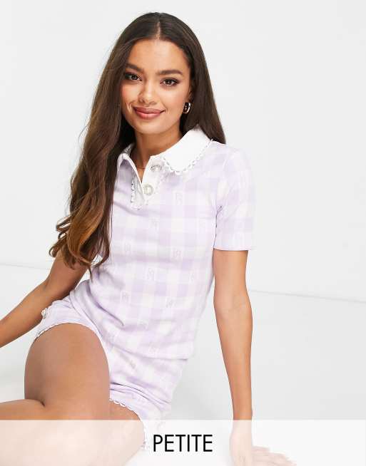 River Island Petite – Kurzärmliges Polohemd aus Jacquard mit Vichykaro in Lila, Kombiteil