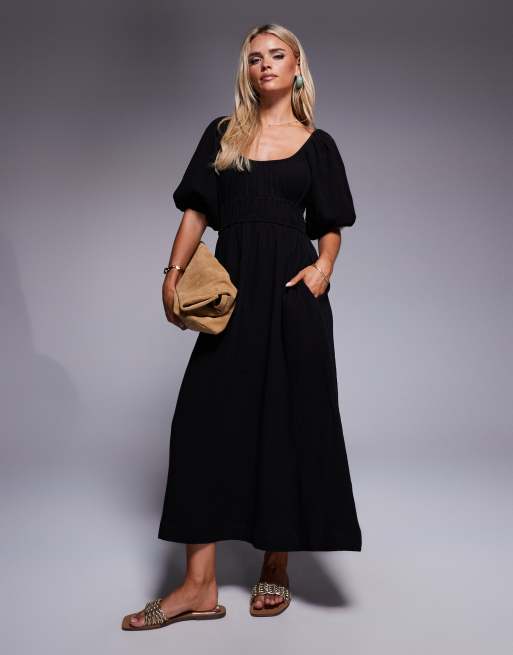 River Island Petite – Midikleid in schwarzer Leinenoptik mit Puffärmeln