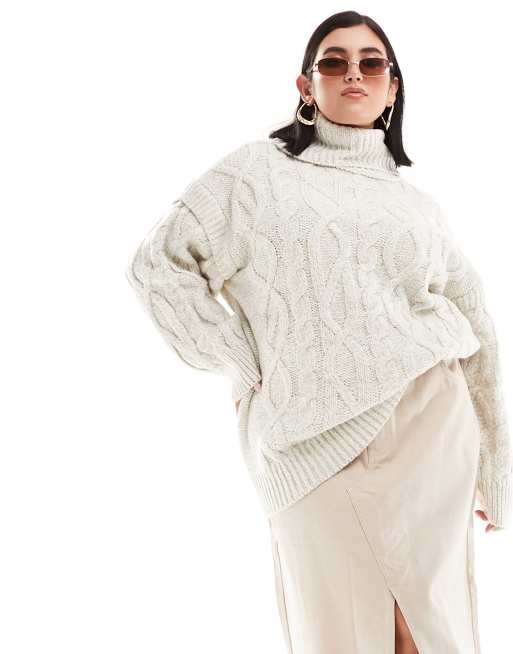 River Island Plus – Gestrickter Rollkragenpullover in Cremeweiß mit Zopfmuster