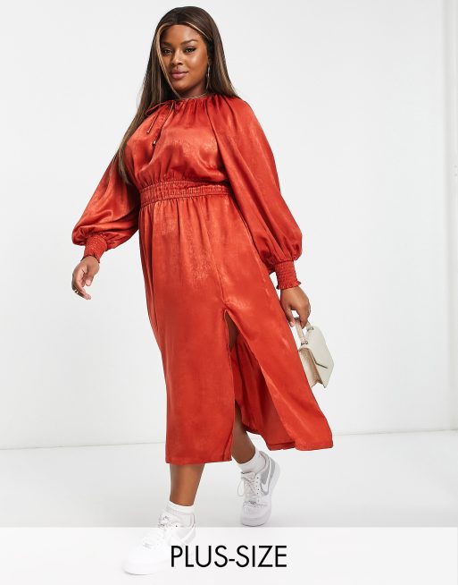 River Island Plus – Satin-Midikleid in Rot mit Ballonärmeln