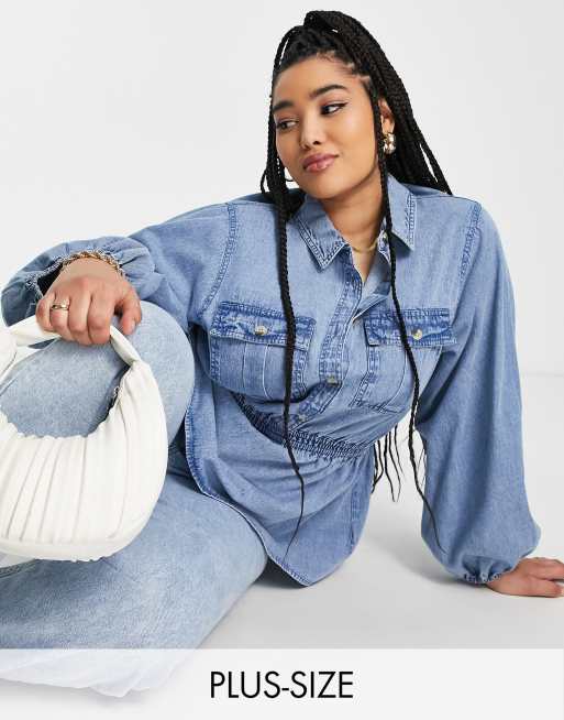 River Island Plus – Utility-Hemd aus Chambray in Blau