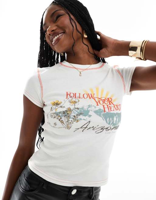River Island – Arizona – Kurz geschnittenes T-Shirt in Creme mit Print