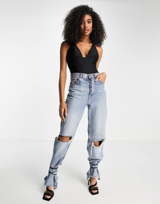 River Island – Ausgeschnittener Bodysuit mit Riemchen in Schwarz
