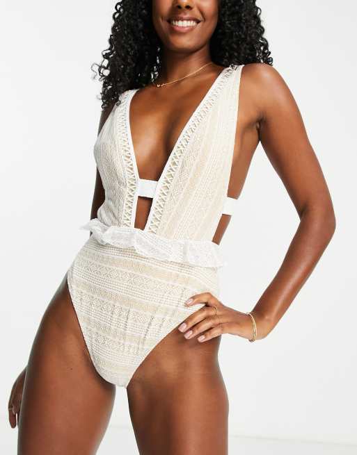 River Island – Badeanzug in Weiß mit Schößchen