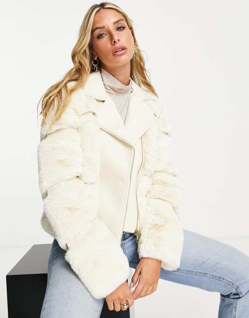 River Island – Bikerjacke mit Kunstfellbesatz in Creme