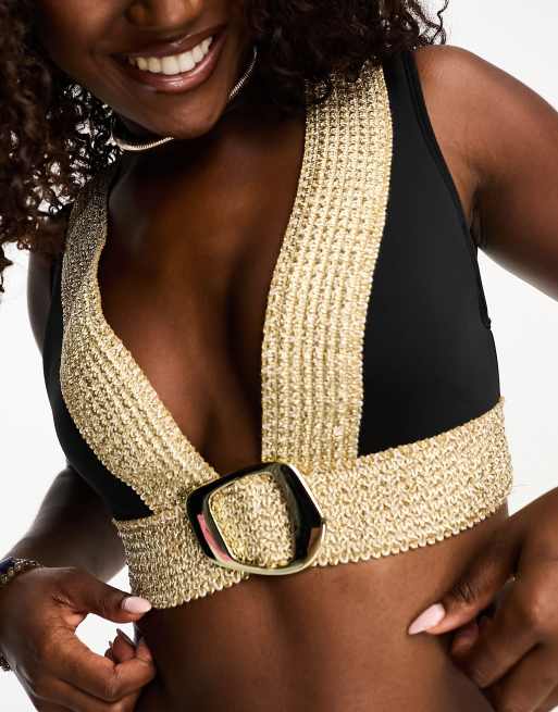 River Island – Bikinioberteil in Schwarz mit tiefem Ausschnitt, Gummibandeinsatz und Schnallenverzierung
