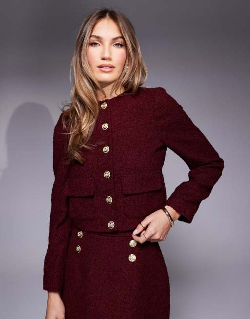 River Island – Elegante Bouclé-Jacke in Burgunderrot, Kombiteil