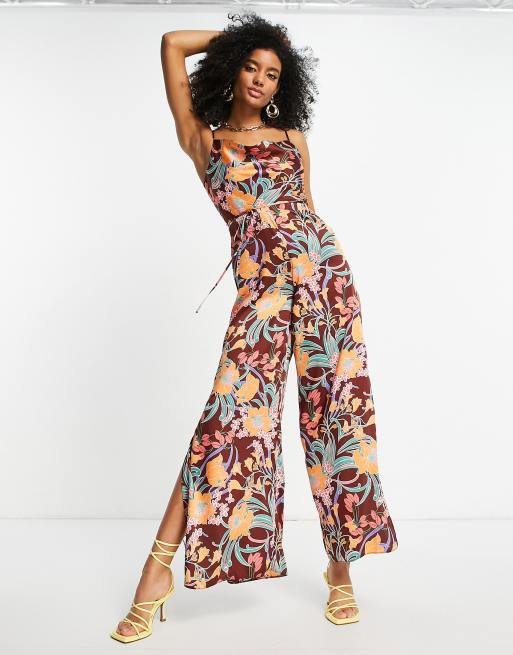 River Island – Geblümter Jumpsuit in Braun mit Schalkragen