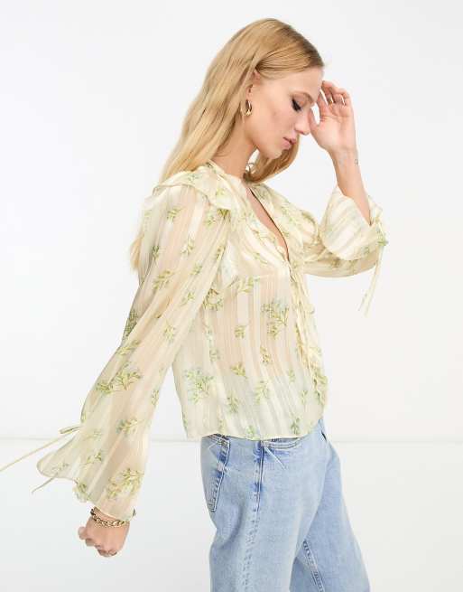 River Island – Gerüschte Chiffonbluse in Creme zum Binden