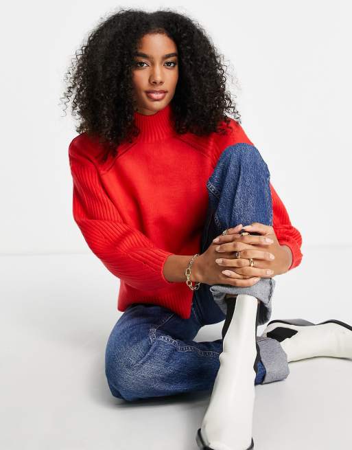 River Island – Hochgeschlossener Pullover in Rot mit gerippten Ärmeln