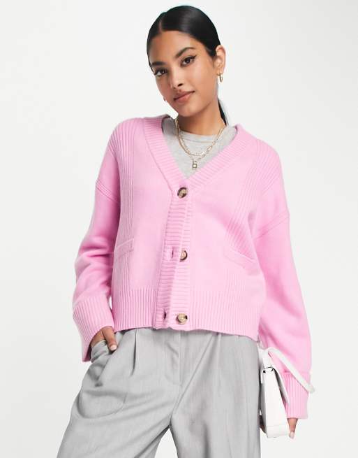 River Island – Kastig geschnittene, gerippte Strickjacke in Hellrosa