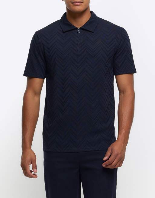 River Island – Kurzärmliges Polohemd in Navy mit Chevronmuster