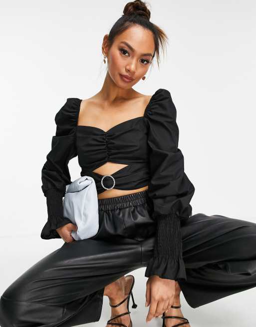 River Island – Kurzgeschnittenes Oberteil in Schwarz mit Puffärmeln und Zierausschnitten