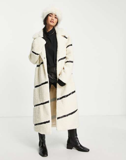 River Island – Mantel in Creme mit Einsätzen aus Teddyfell und Kunstleder