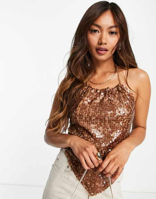 River Island – Neckholder-Oberteil in Braun mit Paillettenverzierung und Zipfelsaum