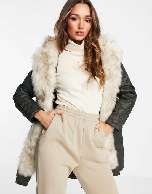 River Island – Parkajacke in Khaki mit Kunstpelzfutter