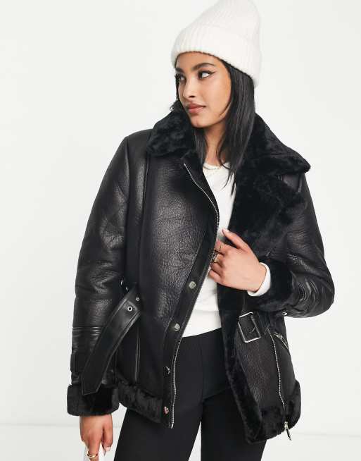 River Island – Pilotenjacke in Schwarz mit Gürtel