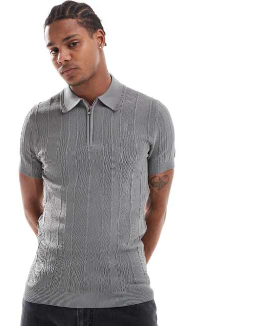 River Island – Polo-Muskelshirt aus Strick in Hellgrau mit Fischgrätmuster