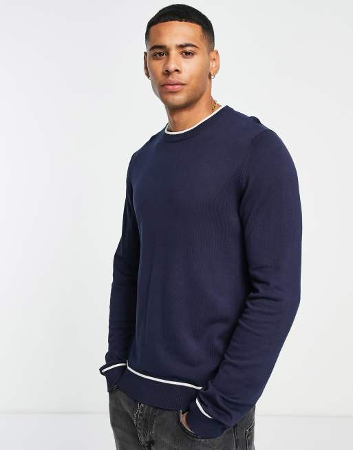 River Island – Pullover in Marineblau mit Rundhalsausschnitt und Zierstreifen