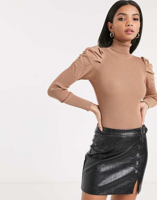 River Island – Rollkragenpullover mit Puffärmeln in Kamel