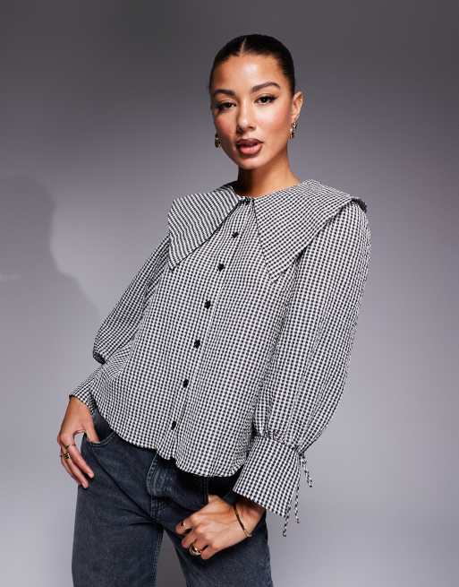 River Island – Schwarz karierte Bluse mit großem Kragen