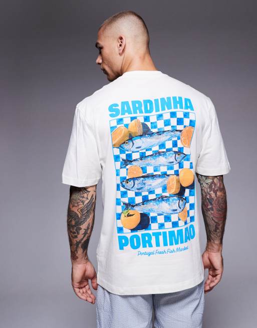 River Island – T-Shirt in Ecru mit Sardinen-Print und normaler Passform