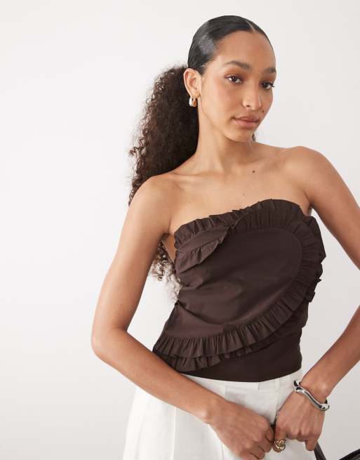 River Island – Trägerloses Oberteil in Dunkelbraun mit Rüschendetail