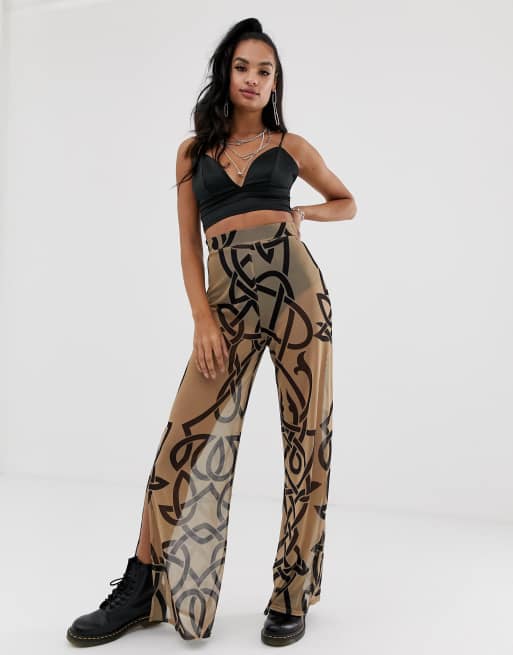 Rokoko – Hose aus Netzstoff mit Ethno-Druck, weitem Bein und seitlichen Schlitzen