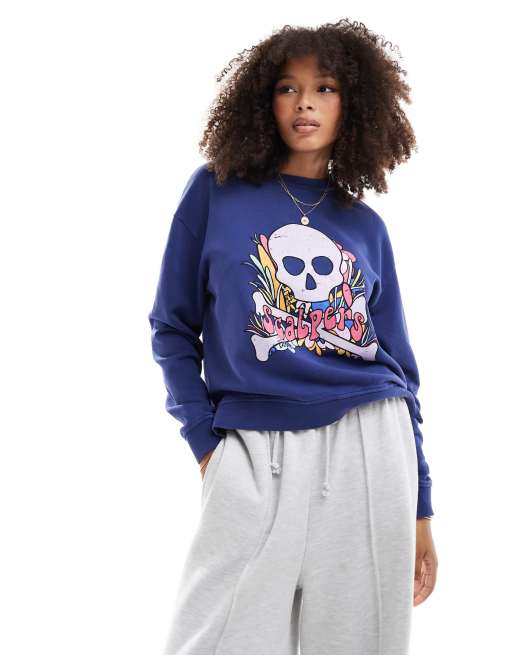 Scalpers – Bunter Pullover in Blau mit Totenkopf-Print