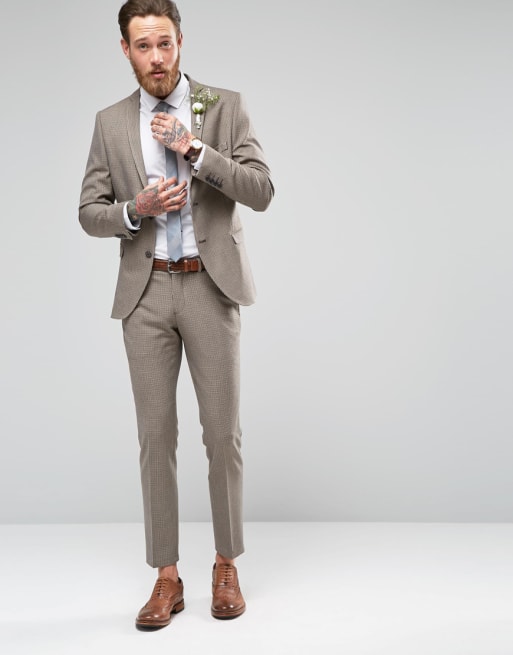Selected Homme – Hellbrauner, enger Stretch-Hochzeitsanzug mit Hahnentrittmuster