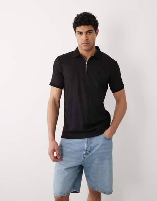 Selected – Geripptes Polohemd in Schwarz mit kurzem Reißverschluss