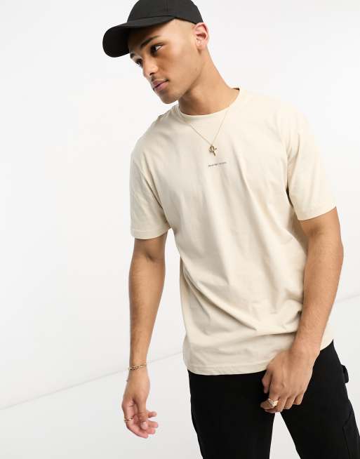 Selected Homme – Oversize-T-Shirt aus Baumwollmix in Beige mit Logo