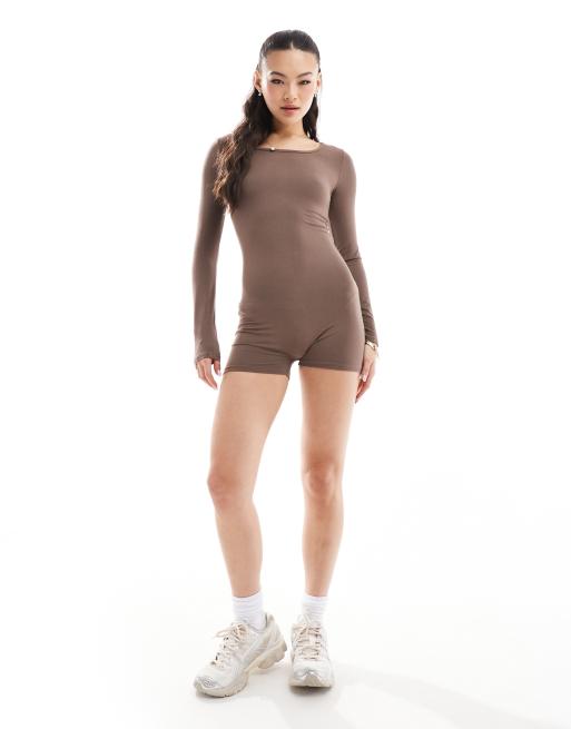 SIMMI – Langärmliger Jersey-Einteiler in Hellbraun mit Rundhalsausschnitt