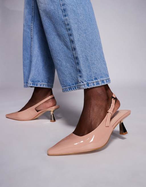 Simmi London Wide Fit – June – Spitze Schuhe in beiger Lackoptik mit Fersenriemen und Kitten-Absatz, weite Passform