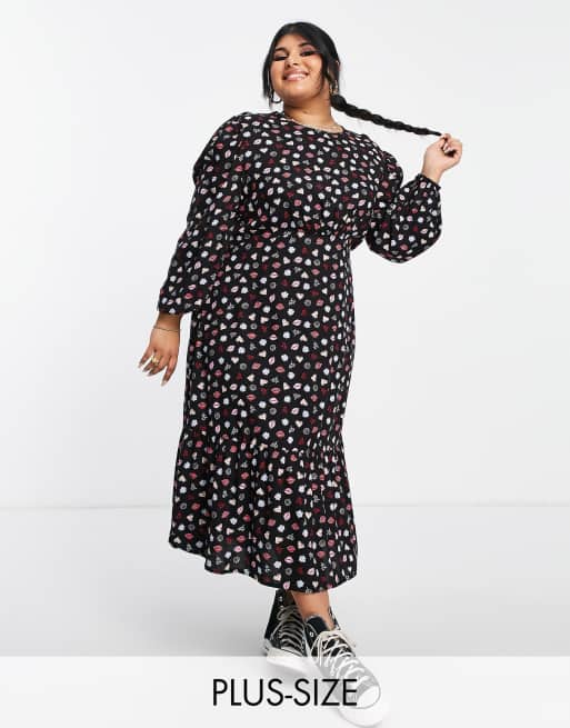 Simply Be – Gestuftes Midikleid in Schwarz mit gerafften Ärmeln und Blumenmuster