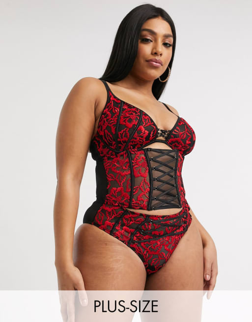 Simply Be – Set aus Spitze mit Lingerie und Korsett in Rot