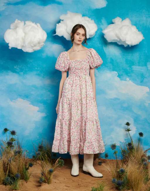 Sister Jane – Gesmoktes Maxikleid in Rosa geblümt mit Puffärmeln