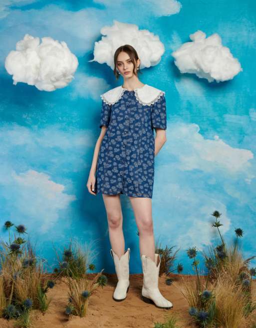 Sister Jane – Kurzes Jeanskleid in Blau mit kontrastierendem Kragen