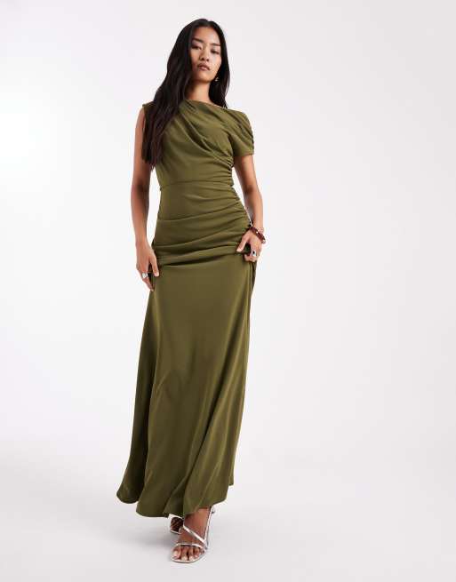Six Stories – Bridesmaids – Brautjungfern-Maxikleid in Grün mit Raffung, asymmetrischem Schulterdetail und Stretchanteil