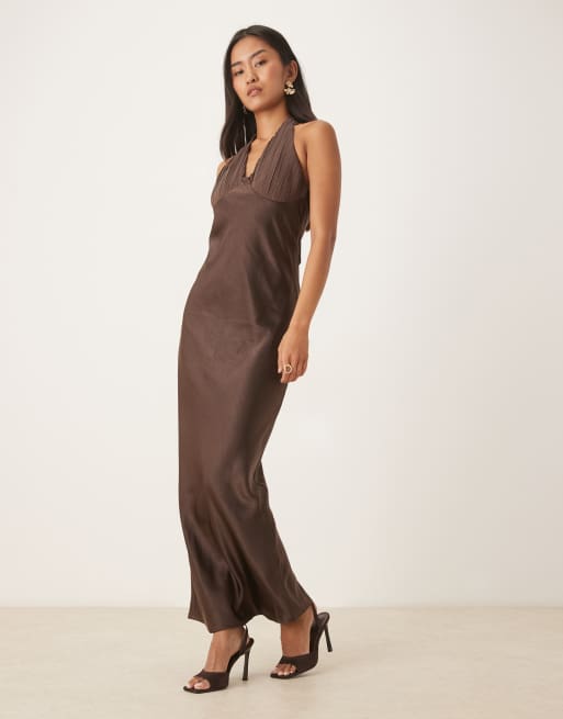 Six Stories – Maxikleid aus Satin in Schokobraun mit Körbchen aus Chiffon