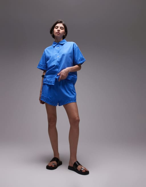 SNDYS – Shorts aus Leinenmix in leuchtendem Blau mit Blumen-Applikationsdetail, Kombiteil