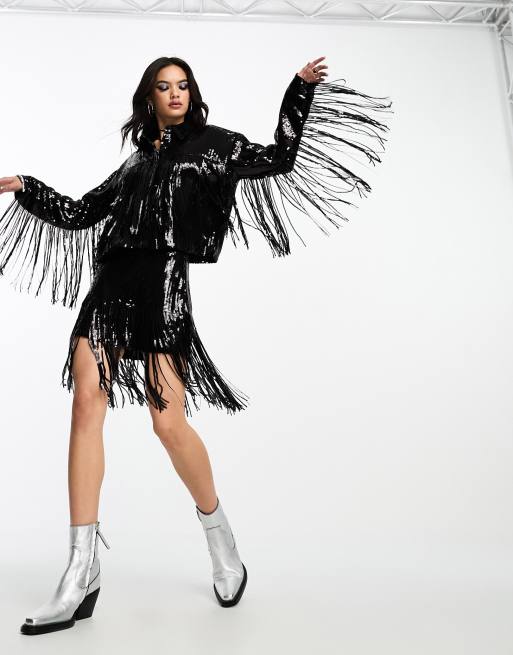 Something New X Emma Fridsell – Minirock in Schwarz mit Paillettenbesatz und Fransen, Kombiteil